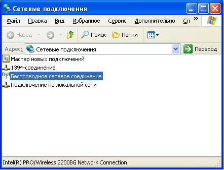 1. В папке «Сетевые подключения» (Пуск – Настройка – Сетевые подключения) Выберите пункт «Беспроводное сетевое соединение» и в контекстном меню (клик правой кнопкой мыши) выберите «Просмотр доступных беспроводных сетей».