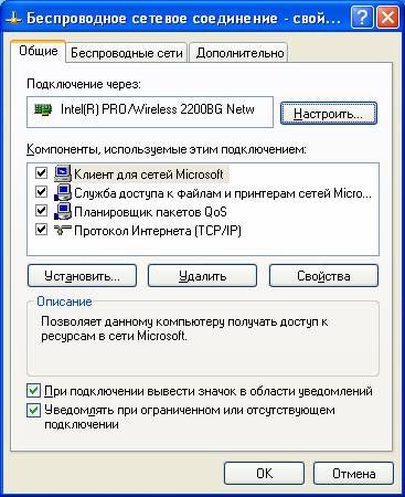 2. В окне «Беспроводное сетевое соединение – свойства». Вкладка «Общие».