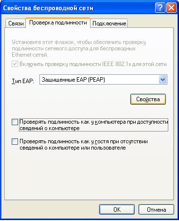 5. Окно «Свойства беспроводной сети». Вкладка «Проверка подлинности».