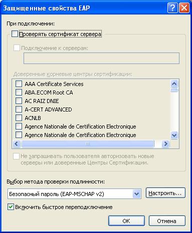 6. В окне «Защищенные свойства EAP» Отключите опцию «Проверять сертификат сервера». Убедитесь, что включена опция «Включить быстрое переподключение». В выпадающем списке «Выбор метода проверки подлинности:» выберите «Безопасный пароль (EAP-MSCHAP v2)». Нажмите кнопку «Настроить...»