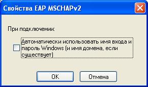 7. В окне «Свойства EAP MSCHAP v2» отключите опцию «Автоматически использовать имя входа и пароль Windows (и имя домена, если существует)». Нажмите «ОК».