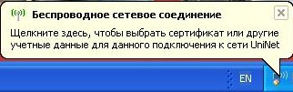 3.Дождитесь (10-30 секунд) пока в нижнем правом углу экрана появится надпись «Щелкните здесь, чтобы выбрать сертификат или другие учетные данные для данного подключения к сети UniNet» и кликните левой кнопкой мыши по ней.