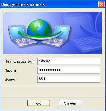 5. В появившемся окне «Ввод учетных данных» необходимо ввести данные для авторизации в сети. Для авторизации в сети «UniNet» используется ваша учетная запись пользователя интрасети. в домене BSU.