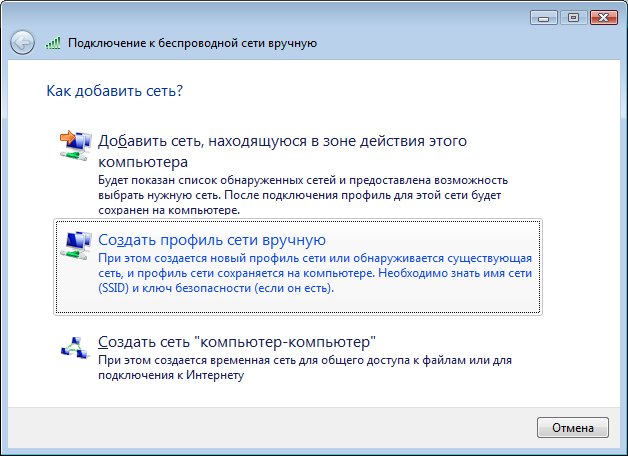В окне Подключение к беспроводной сети вручную выберите Создать профиль сети вручную.