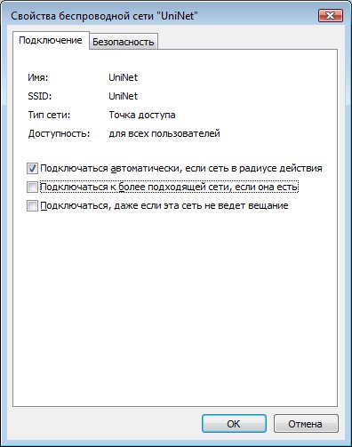 В окне Свойства беспроводной сети UniNet на вкладке подключение отключите опцию Подключаться к более подходящей сети, если она есть. Перейдите на вкладку Безопасность.