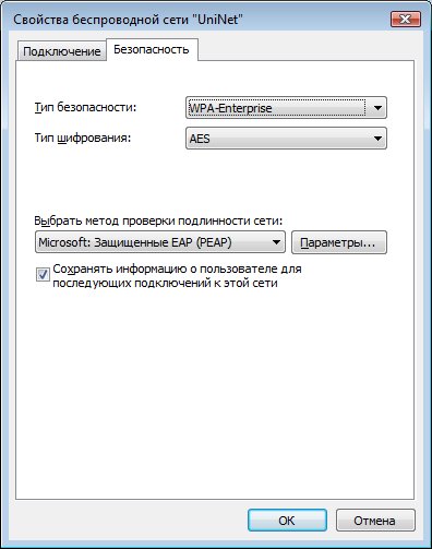 попробуйте удалить профиль сети UniNet (Пуск-Панель Управления-Центр управления сетями и общим доступом-Управление беспроводными сетями, выберите UniNet, нажмите Удалить), и повторите всю настройку с самого начала.