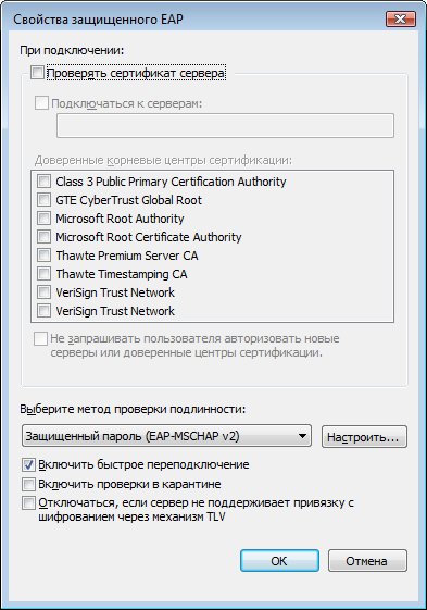В окне Свойства защищенного EAP отключите опцию Проверять сертификат сервера. Убедитесь, что методом проверки подлинности выбран Защищенный пароль (EAP-MSCHAP v2), а также убедитесь, что включена опция Включить быстрое переподключение. Нажмите кнопку Настроить...