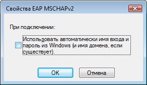 В окне Свойства EAP MSCHAP v2 отключите опцию Использовать автоматически имя входа и пароль Windows (и имя домена, если существует). Нажмите ОК