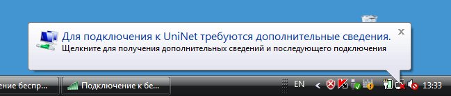 В правой нижней части экрана должно появиться всплывающее сообщение Для подключения к UniNet требуются дополнительные сведения (сообщение может появиться не сразу а через несколько секунд), кликните по нему левой кнопкой. Если сообщение не появилось в течение минуты переходите к п.16.