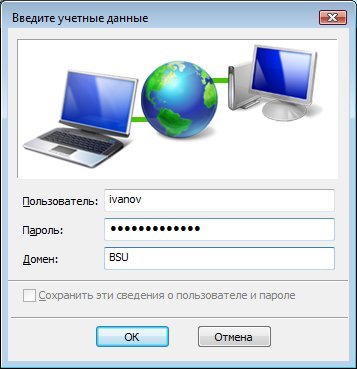 В появившемся окне Введите учетные данные необходимо ввести данные для авторизации в сети UniNet. Для авторизации необходимо использовать Вашу учетную запись пользователя интрасети в домене BSU. Нажмите кнопку OK.